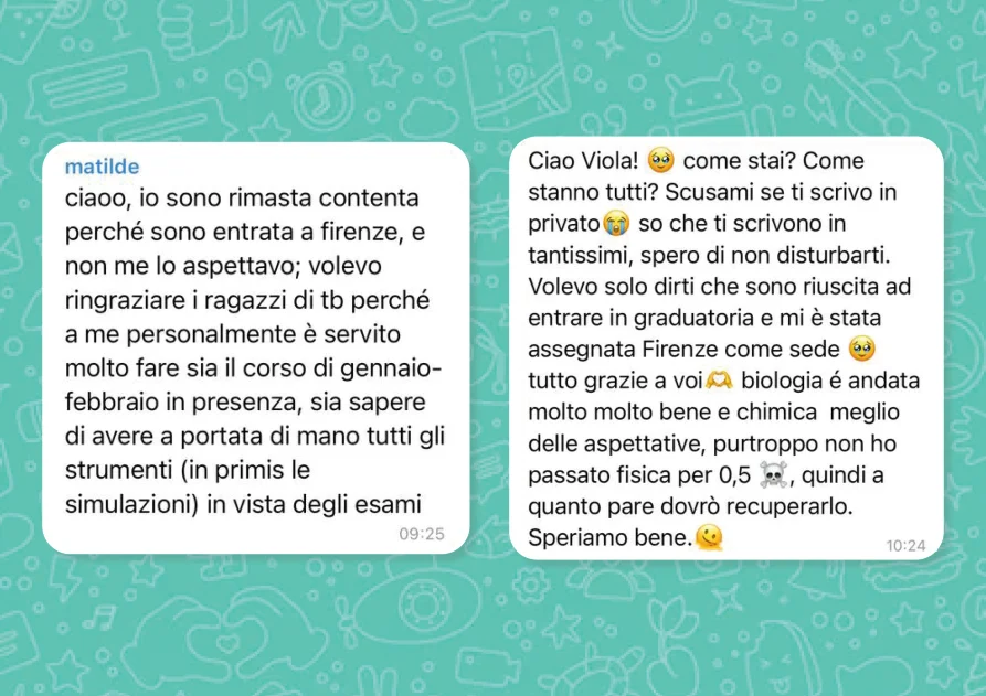 "Consigli e dritte molto chiari e precisi, docenti molto disponibili sia a livello didattico sia come sostegno e supporto per la gestione dell’ansia. Simulazioni molto utili che permettevano di ricreare la situazione classica del test d’ingresso"